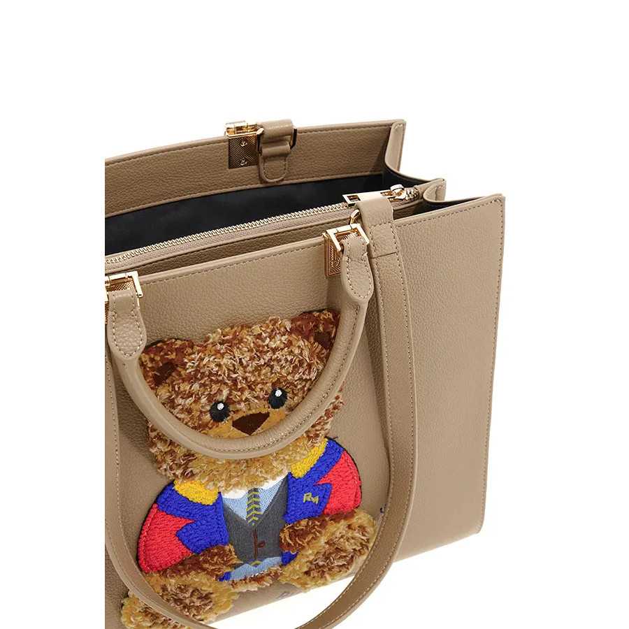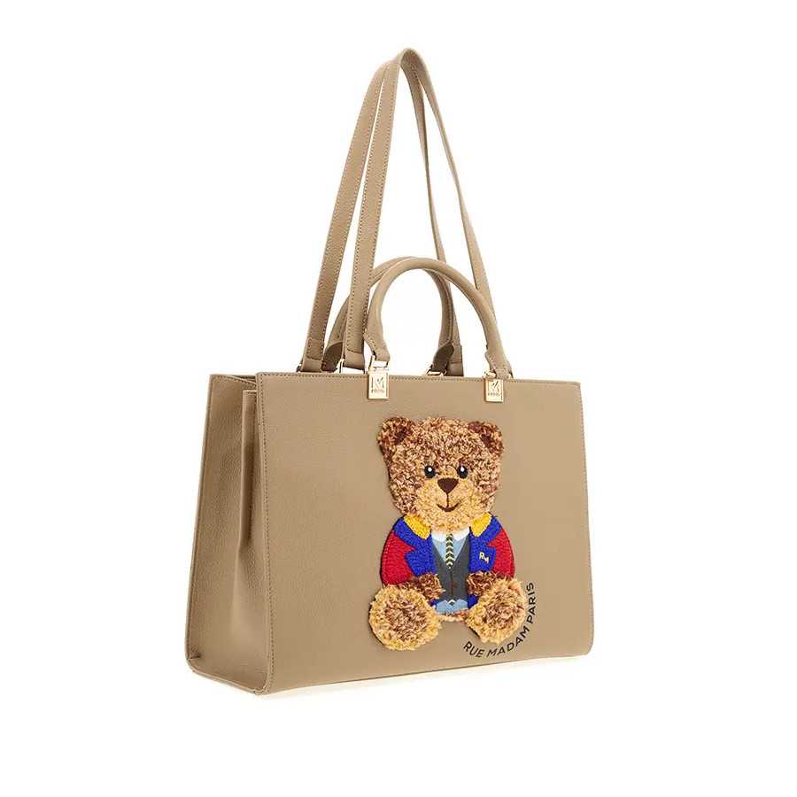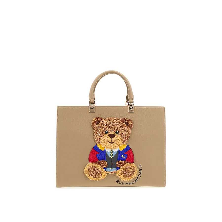 Bolso beige mini tote Rue Madam. El oso Marvin característico de la marca, en la parte delantera, muy suave, bordado, y el logo de Rue Madam en letras negras, pero discreto. Eco piel. Asas para llevar en la mano o en el brazo. Asa extraíble y regulable para llevar cruzado o en el hombro. Tres compartimentos: el del medio con cierre de cremallera, los otros dos con dos bolsillos, uno de ellos con cremallera.