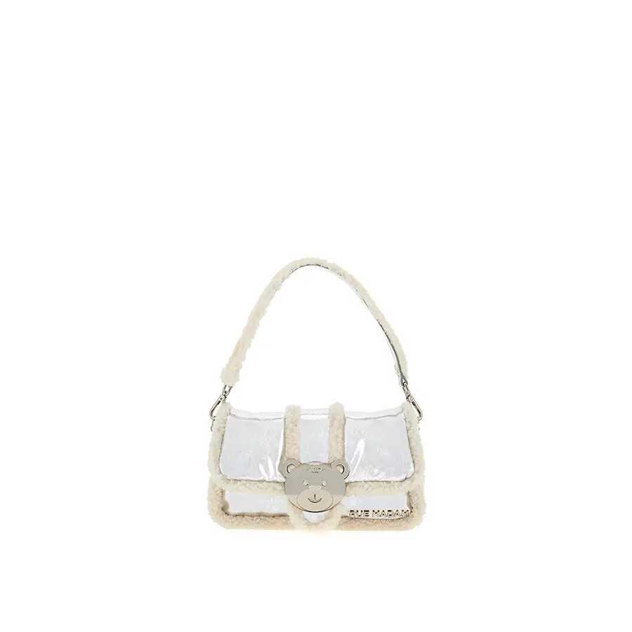 Bolso alargado color pateado metalizado Rue Madam. Ecopiel laminada. Con peluche blanco de oveja alrededor de todo el bolso. En parte delantera la cara del oso de la marca en plata. Cierre con botón magnético oso. Asa larga en plata para llevar al hombro o cruzado. Asa aparte blanco peluche y dorado, para llevar en el brazo o en la mano. Dos bolsillos delanteros, uno de ellos con cremallera.