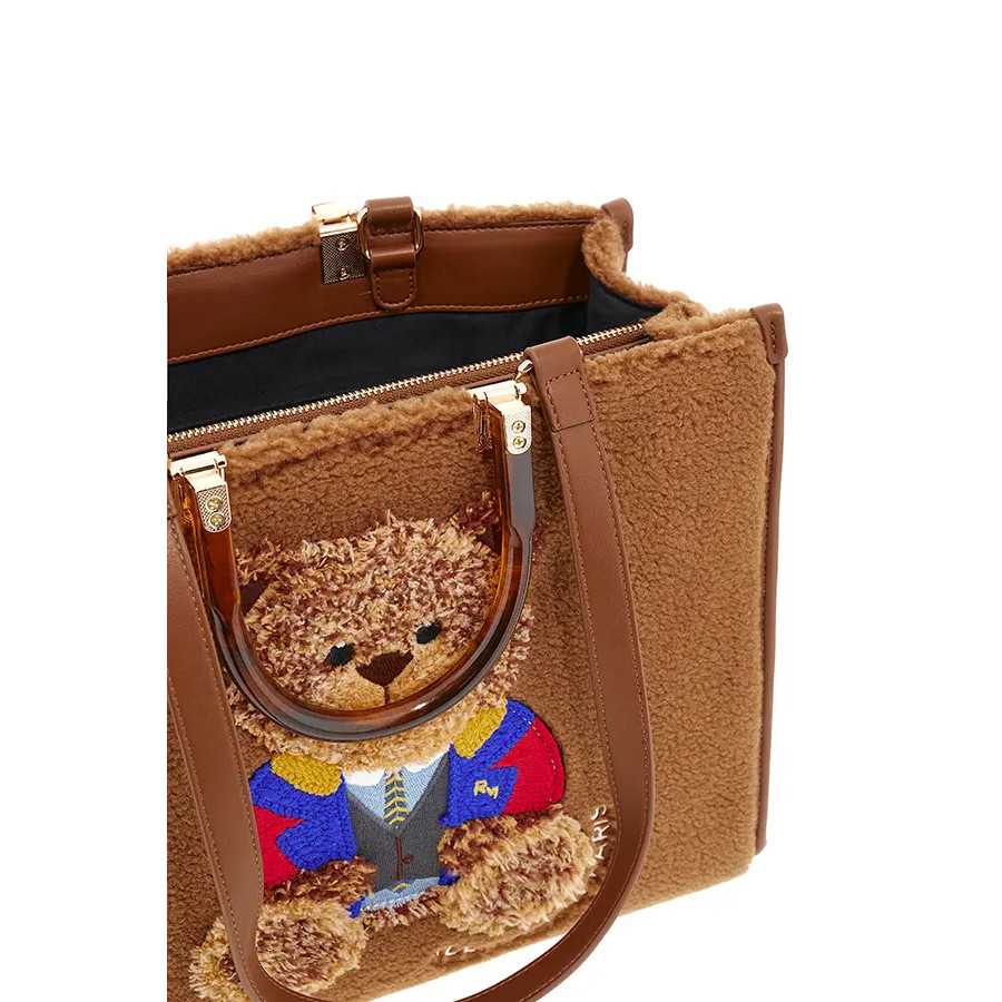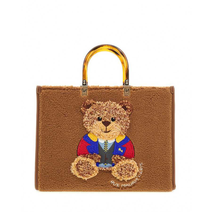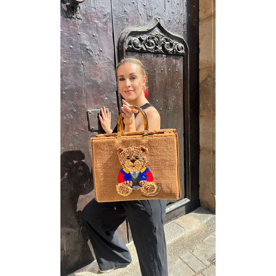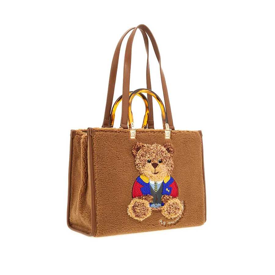 Bolso tote bag color marrón de peluche, con el oso Marvin bordado de Rue Madam grande. Logo parte delantera, a un lado del oso, discreta. Dos asas de carey en color marrón, para llevar en la mano o el brazo. Dentro dos asas (no pueden quitarse, pero si esconderse), muy cómodas y novedosas, para llevar al hombro. Tres departamentos: el del medio con cierre de cremallera, y los otros dos con tres bolsillos, uno de ellos con cremallera. Bolsa para resguardarlo.