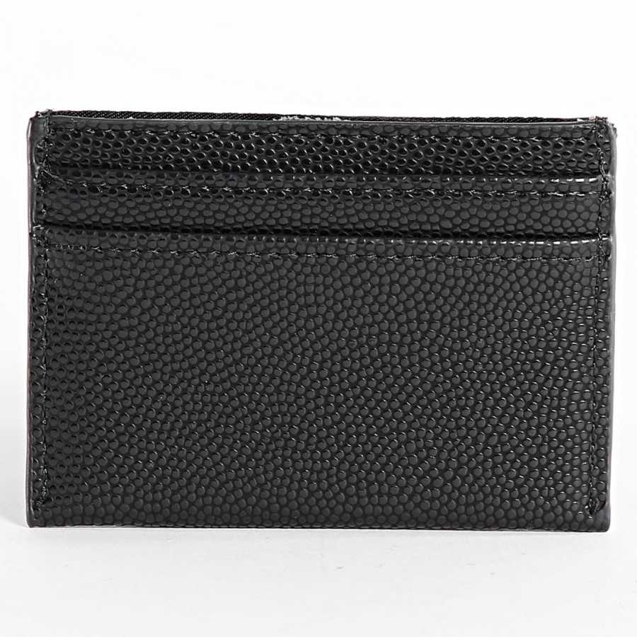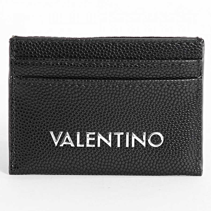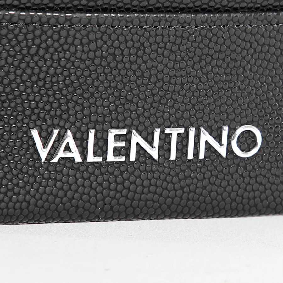 Tarjetero negro by Valentino. Piel sintética, rugosa pero gustosa al tacto. Un compartimento en medio y dos delanteros, y dos traseros. Para tarjetas, documentación... Marca en parte delantera en plateado.