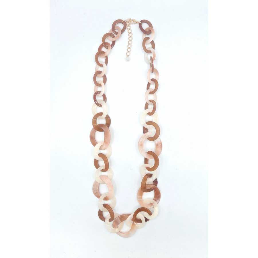 Collar largo de acrílico con eslabones ovalados de diversos tamaños. Combina tonos tierra y neutros, desde cremas a marrones cálidos, para un diseño versátil. Dispone de cadena regulable con extensión (7cm) y longitud total de 105cm.