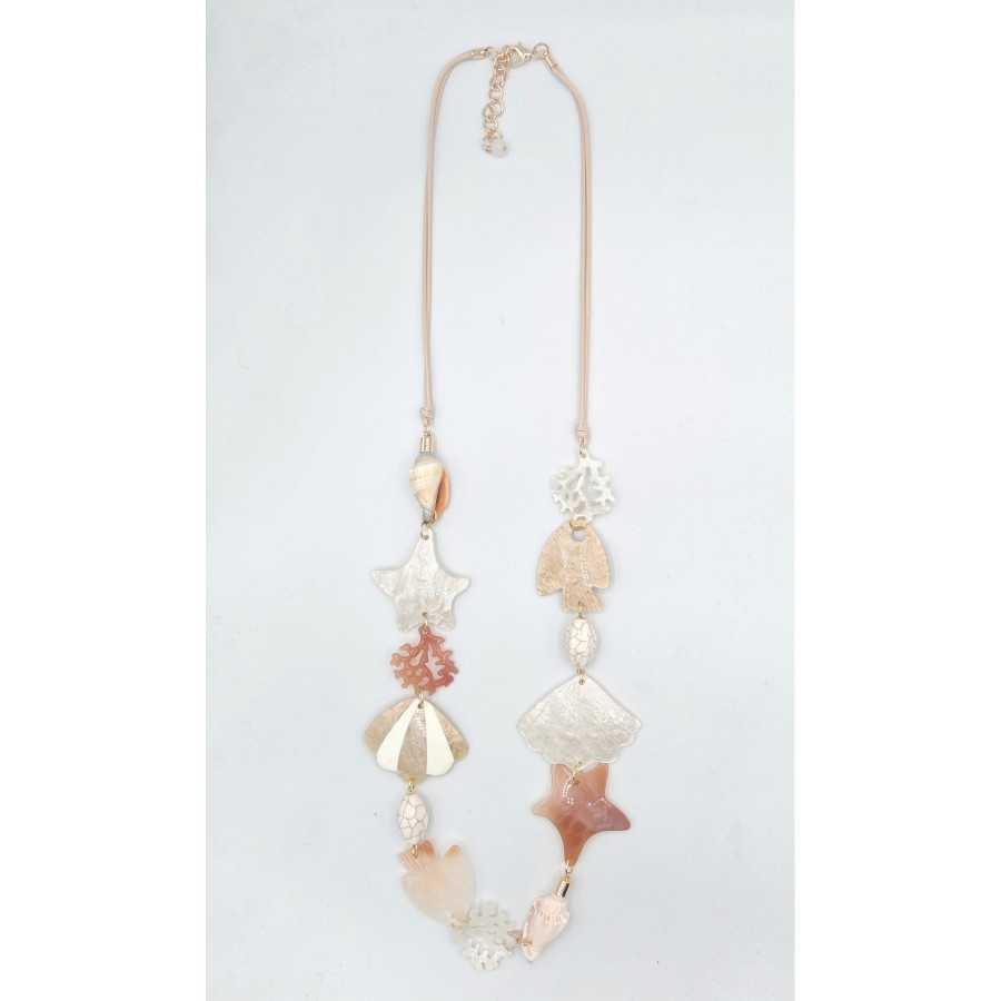 Collar largo con conchas y elementos marinos de acrílico en tonos neutros y rosados suaves. Su diseño asimétrico incluye conchas espirales, formas de abanico y evocaciones de coral. Presenta una cadena fina y un cierre regulable con extensión.