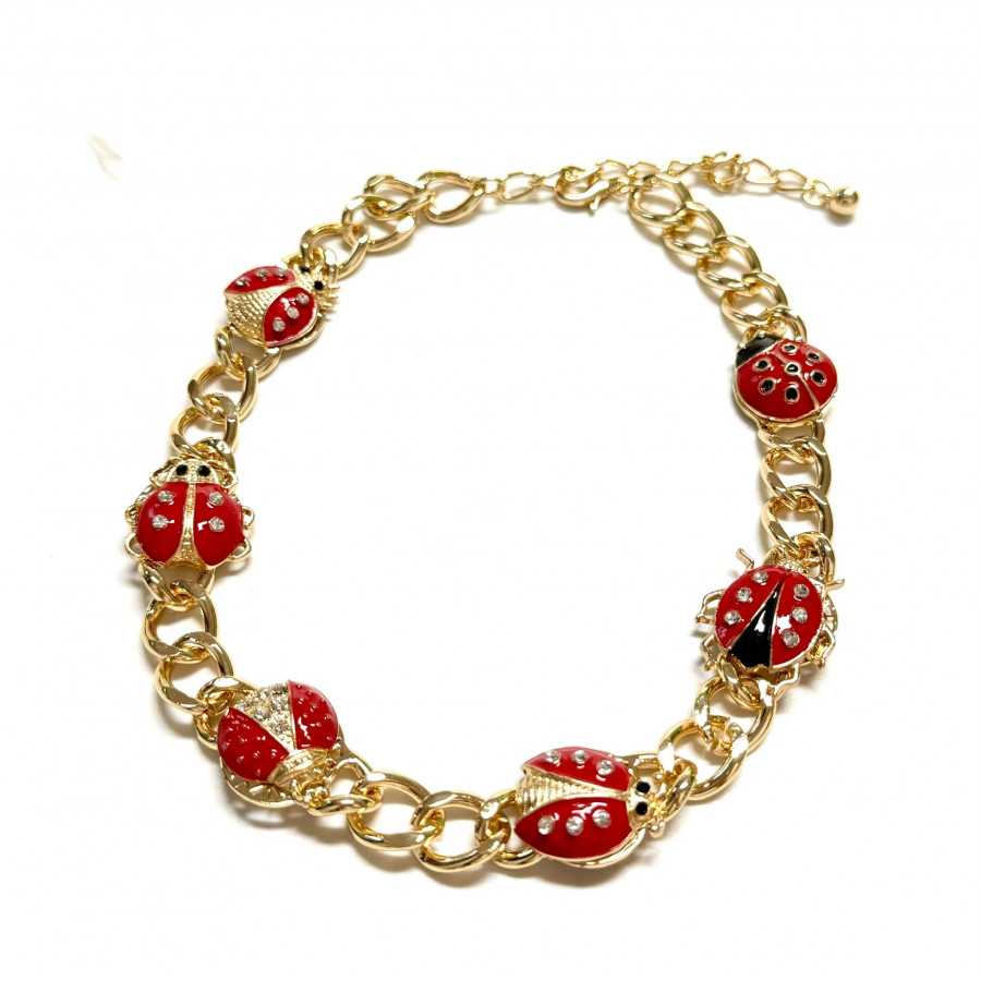 Collar dorado con mariquitas rojas esmaltadas e incrustaciones brillantes. Joya llamativa y elegante, perfecta para eventos o para un look con carácter.