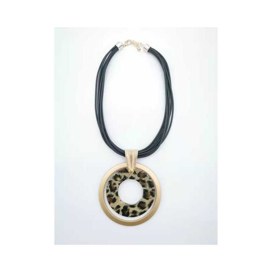Collar con cordones negros y colgante circular dorado con estampado de leopardo. Un diseño salvaje y elegante que no pasa desapercibido.