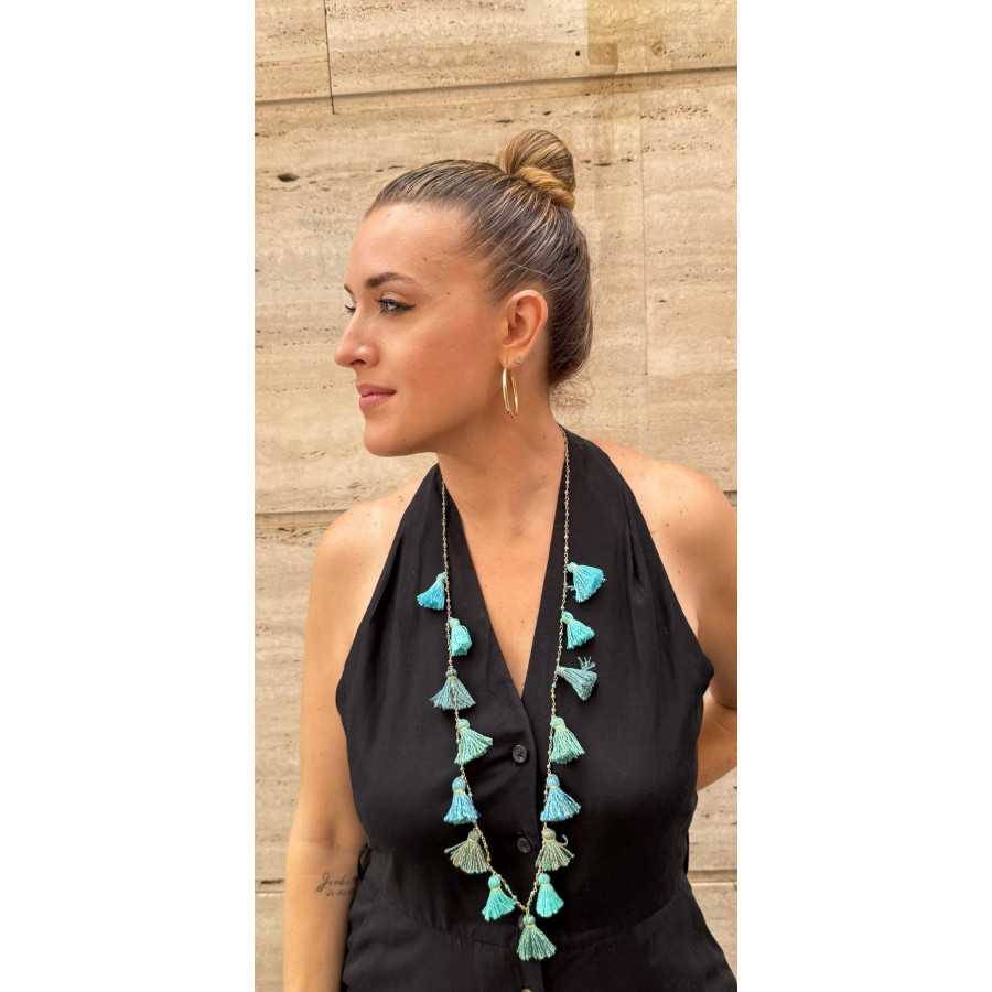 Collar largo con borlas en tonos azulados y piedras naturales pequeñas. Un tipo de collar que queda especialmente bien en verano: divertido, bonito, ligero...