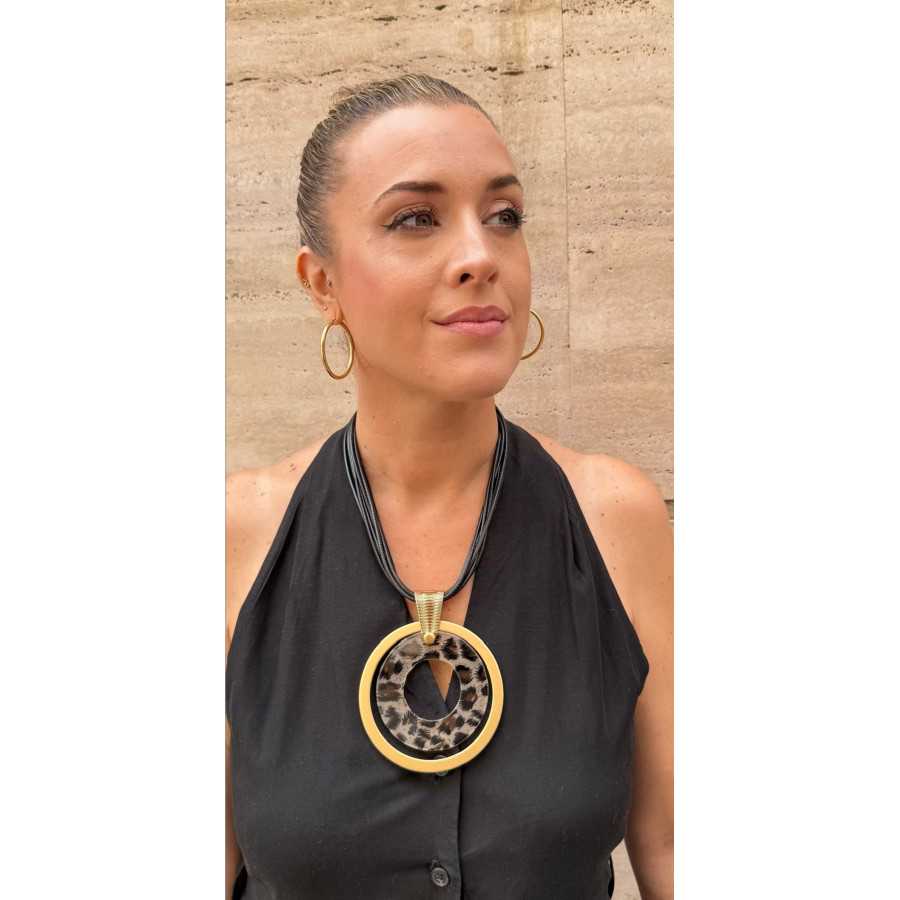 Collar con cuerda de 7 vías en negro y un colgante espectacular. Un doble círculo en dorado y en animal print marrón. Se puede poner más corto o más largo, según preferencias.