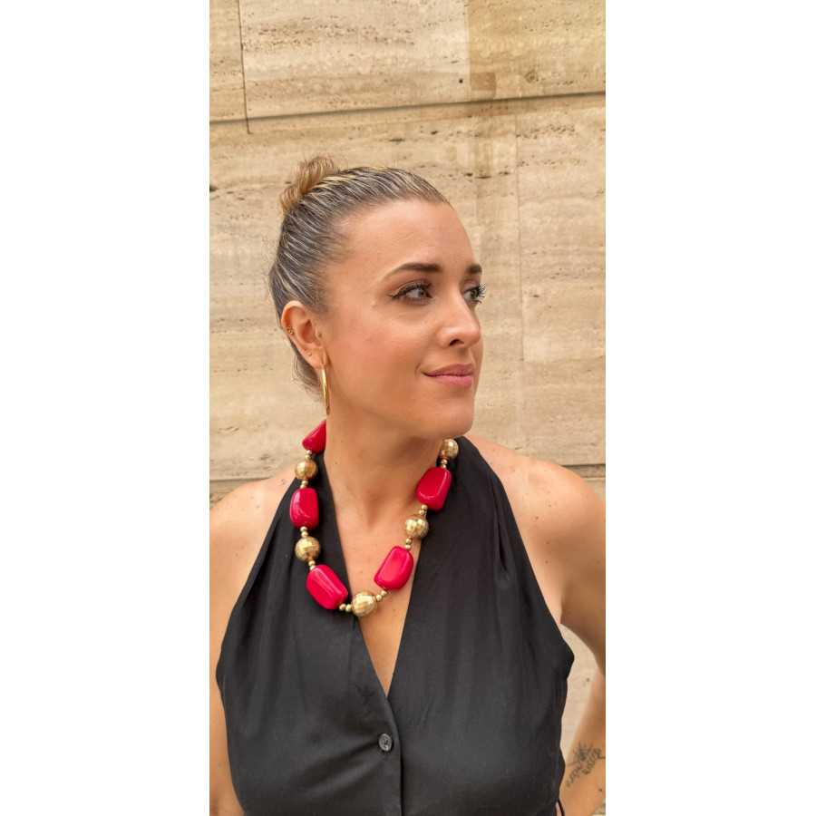 Collar regulable de acero, que combina piedras esmaltadas de un rojo cereza, con bolas doradas. Elegante, pero perfectamente ponible en el día a día. Original, bonito y con un toque nostálgico.