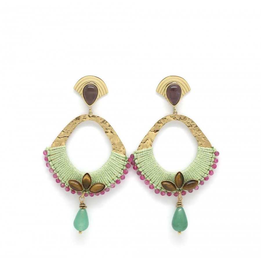 Descubre nuestros pendientes étnicos hechos a mano. Combinan metal dorado, hilo verde menta y toques fucsia, con piedras turquesas. Ligeros y llenos de color para un estilo bohemio y original.