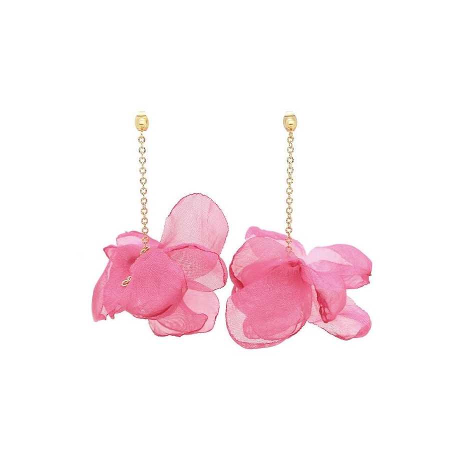 Dale un toque romántico y femenino a tu look con estos pendientes florales de inspiración parisina. Con cadena dorada y flor de tela fucsia, son ligeros, elegantes y perfectos para destacar con estilo.